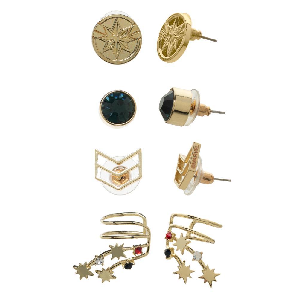 Add some superhero style to your collection of jewelry with this Captain Marvel earrings set. The 4-pack includes 3 sets of stud earrings and 1 set of ear cuffs, all with their own unique design. The stud earrings give you a minimalist style while the ear cuffs are perfect for unpierced ears. Captain Marvel merchandise like these earrings and ear cuffs will surely become collectible pieces of Marvel fan merchandise. Show the world Captain Marvel is your favorite superhero by making these earrings and ear cuffs a part of your fashion accessories.
